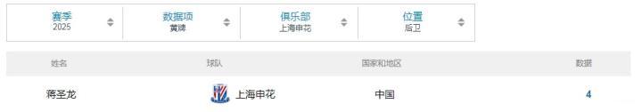 中超联赛第27轮,上海申花客场2-1击败青岛西海岸。此役上半场第43分钟,上海申花后卫蒋圣龙在争顶时犯规,被主裁判出示黄牌警告。接下来,蒋圣龙将因累积四黄停赛,缺席本周末主场对阵大连英博的比赛。