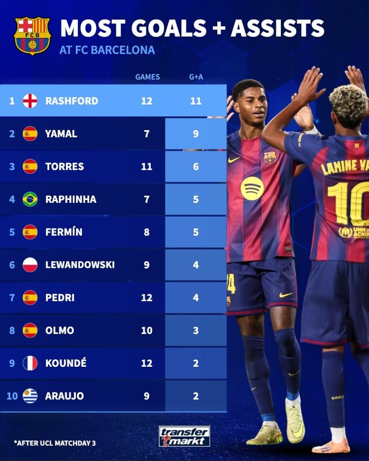 根据统计,本赛季到目前为止,拉什福德已经代表巴萨出场12次,打进5球并且送出了6记助攻,他的直接参与进球数目前是队内最多的。