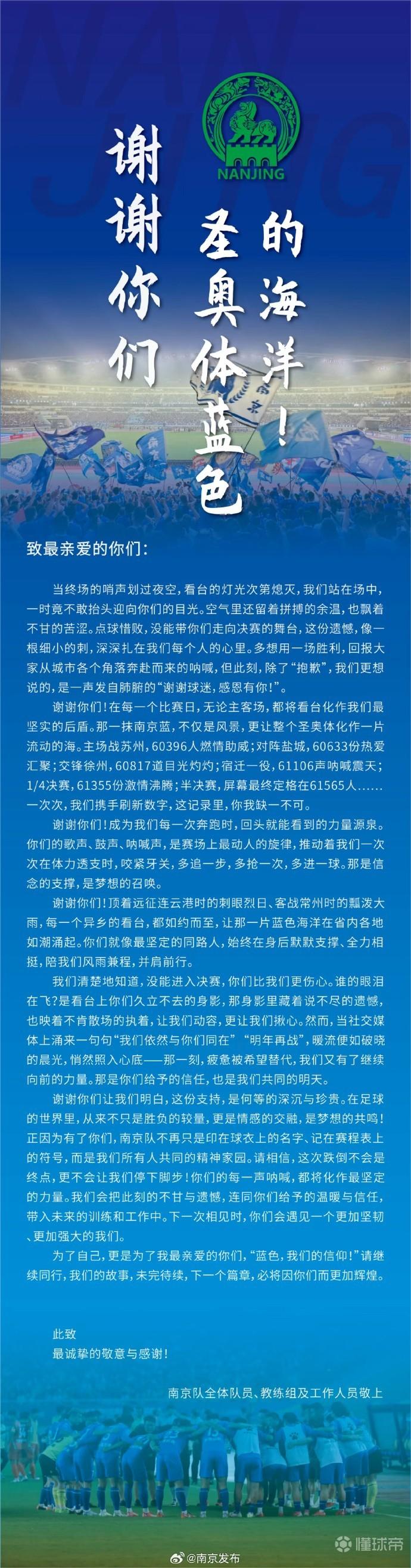 谢谢你们让我们明白,这份支持,是何等的深沉与珍贵。在足球的世界里,从来不只是胜负的较量,更是情感的交融,是梦想的共鸣!正因为有了你们,南京队不再只是印在球衣上的名字、记在赛程表上的符号,而是我们所有人共同的精神家园。请相信,这次跌倒不会是终点,更不会让我们停下脚步!你们的每一声呐喊,都将化作最坚定的力量。我们会把此刻的不甘与遗憾,连同你们给予的温暖与信任,带入未来的训练和工作中。下一次相见时,你们会遇见一个更加坚韧、更加强大的我们。