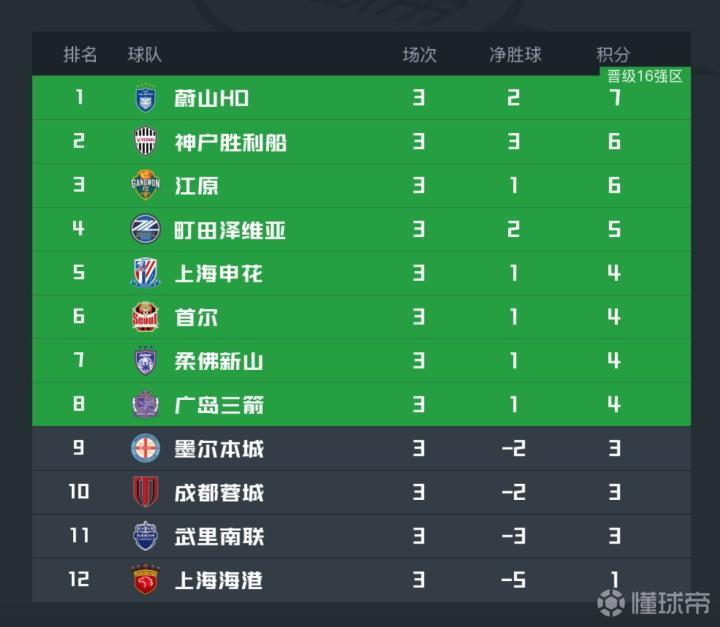 蔚山HD凭借1-0战胜广岛三箭的比赛结果成功登顶,神户胜利船让三追三后遭到江原绝杀掉至第二。