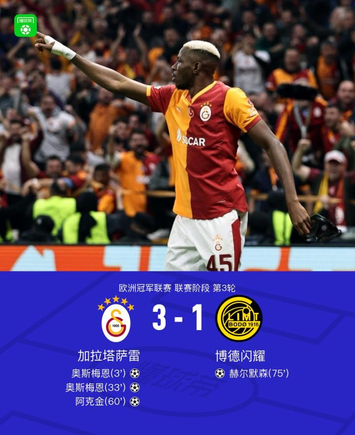 加拉塔萨雷3-1博德闪耀,奥斯梅恩双响,阿克金破门