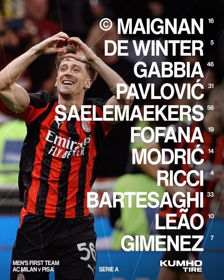 AC米兰首发:16-迈尼昂、5-德温特、46-加比亚、31-帕夫洛维奇、56-萨勒马克尔斯、19-优素福-福法纳、14-莫德里奇、4-萨穆埃莱-里奇、33-巴尔泰萨吉、7-圣地亚哥-希门尼斯、10-莱奥