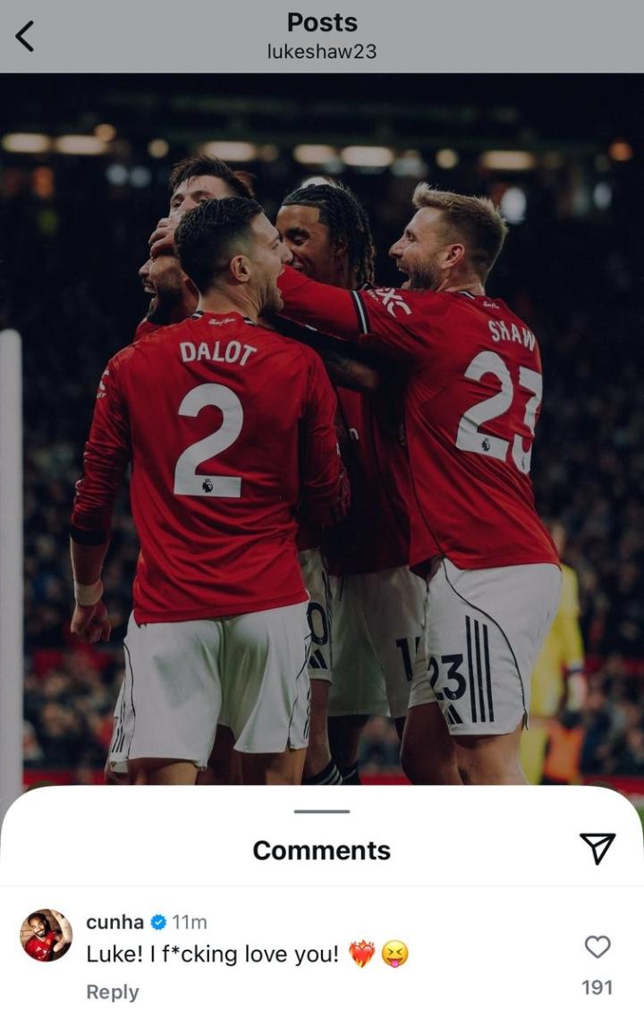 恢复健康的卢克-肖本场比赛继续为曼联首发,赛后他晒出了庆祝库尼亚进球的照片,并配文:“让我们继续保持这种势头(Let’s keep the momentum 🧱)”