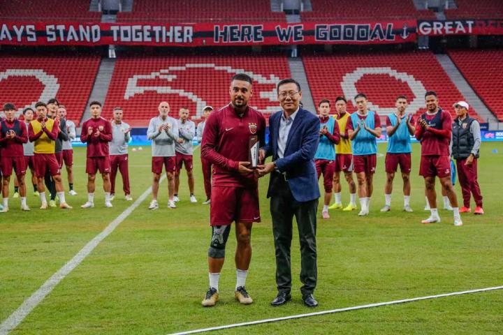 训练开始前,海港俱乐部党总支书记、总经理沙良昌分别为莱昂纳多颁发中超联赛第25轮最佳球员奖项,为李帅颁发百场纪念球衣。
