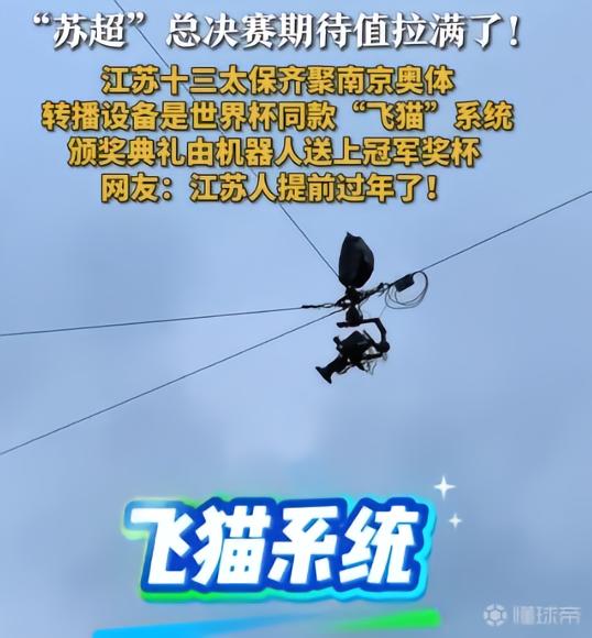 据悉,“苏超”总决赛的转播设备是世界杯同款“飞猫”系统,采用世界杯同款转播技术,配备飞猫索道摄像系统与索尼4K-HDR摄像机,构建地空协同的立体转播矩阵。智能追踪技术精准锁定球员动态,多维度视角让观众自由切换全景、战术与特写镜头。此外决赛的颁奖典礼将由机器人送上冠军奖杯。