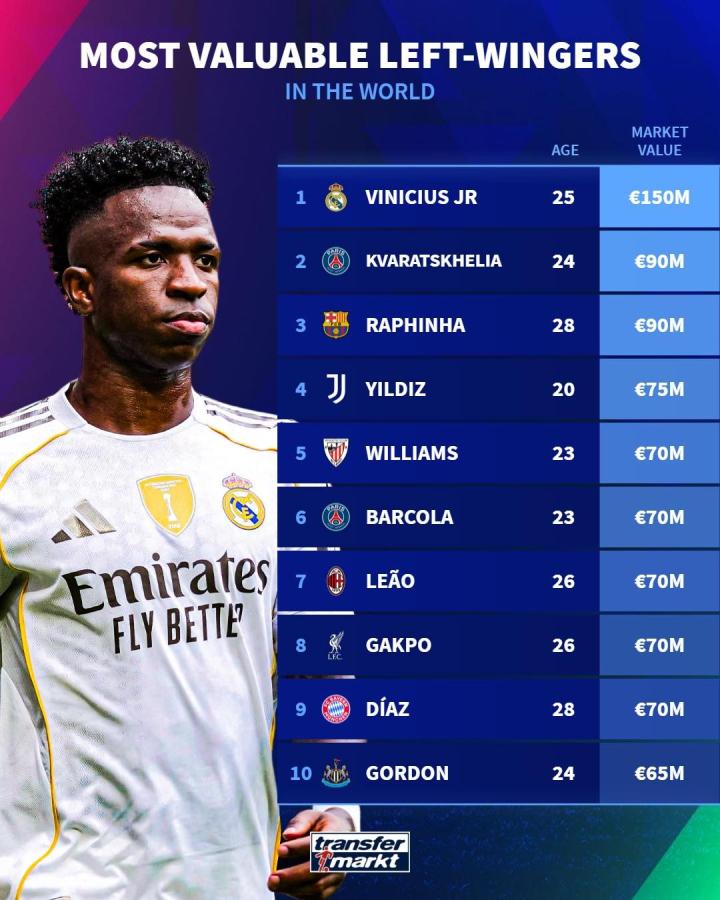 在完成最新一次身价更新后,德国转会市场网站列出了世界足坛左边锋身价榜,维尼修斯以1.5亿欧居首,克瓦拉茨赫利亚、拉菲尼亚紧随其后。