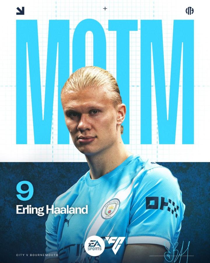 英超第10轮,曼城主场3-1击败伯恩茅斯,此役上演梅开二度的哈兰德当选曼城队内全场最佳球员。