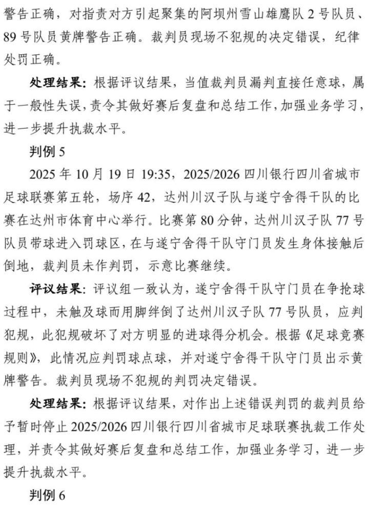 本次一共有6个判例进行了评议,其中判例1和判例2出自同一场比赛,裁判员漏判了2个点球,因此对裁判员暂停执法工作。