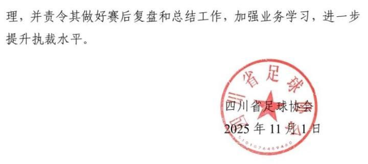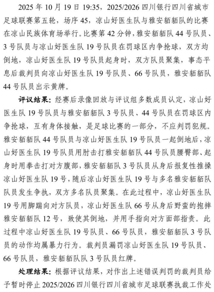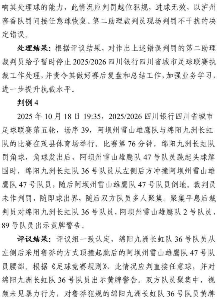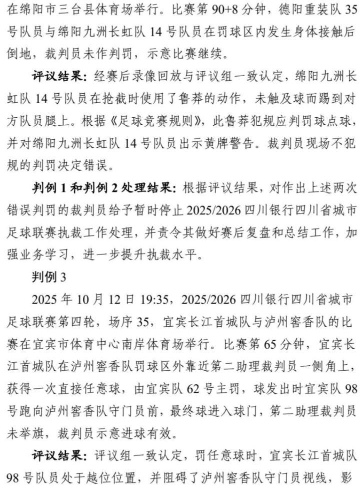 近日,四川省城市足球联赛(川超)组委会公布了前六轮争议判罚评议报告及处理结果。