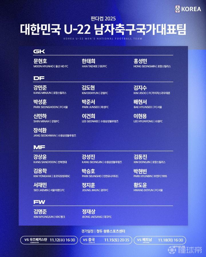 北京时间11月4日,韩国足协公布了韩国U22前往中国参加熊猫杯的大名单,其中德乙球员金志树在列,3名留洋球员入选。