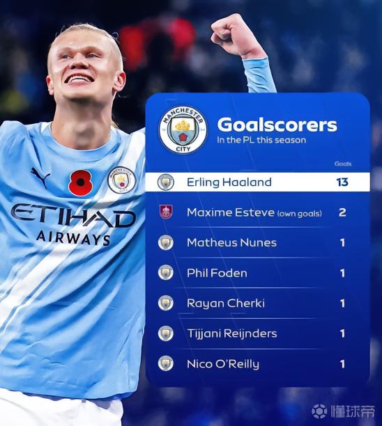 根据统计,本赛季到目前为止,哈兰德在英超联赛中已经打进了13个进球,是曼城队内联赛进球最多的,而他们进球第二多的是乌龙球,而且都是伯恩利后卫埃斯泰夫打进的,其他球员都只打进了1球。