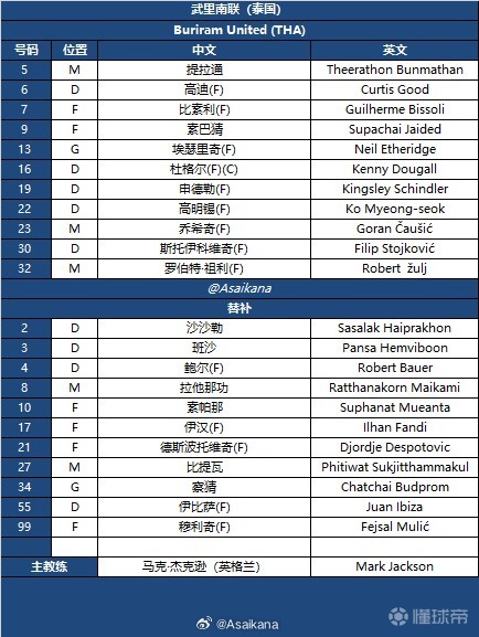 武里南联首发:5-提拉通、6-高迪、7-比索利、9-素巴猜、13-埃瑟里奇、16-杜格尔、19-申德勒、22-高明锡、23-乔希奇、30-斯托伊科维奇、32-祖利