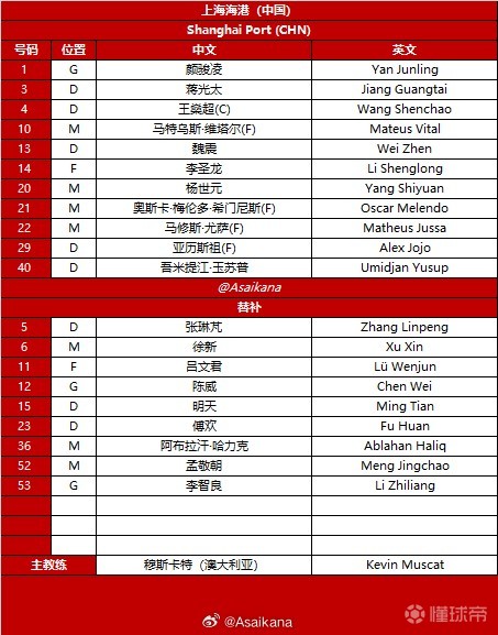 北京时间11月4日20:15,亚冠精英联赛小组赛第4轮,上海海港客场挑战武里南联,赛前双方公布本场比赛的首发阵容: