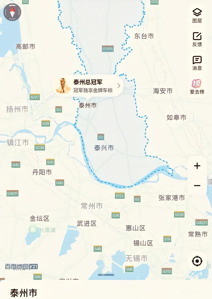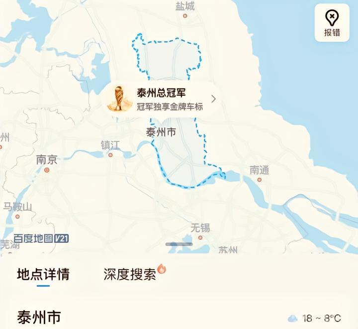 2025赛季“苏超”总决赛,泰州队经过点球大战击败南通队,夺得冠军。在泰州队夺冠后,百度地图APP搜索泰州市有新的变化——出现了醒目的“泰州总冠军”字样。