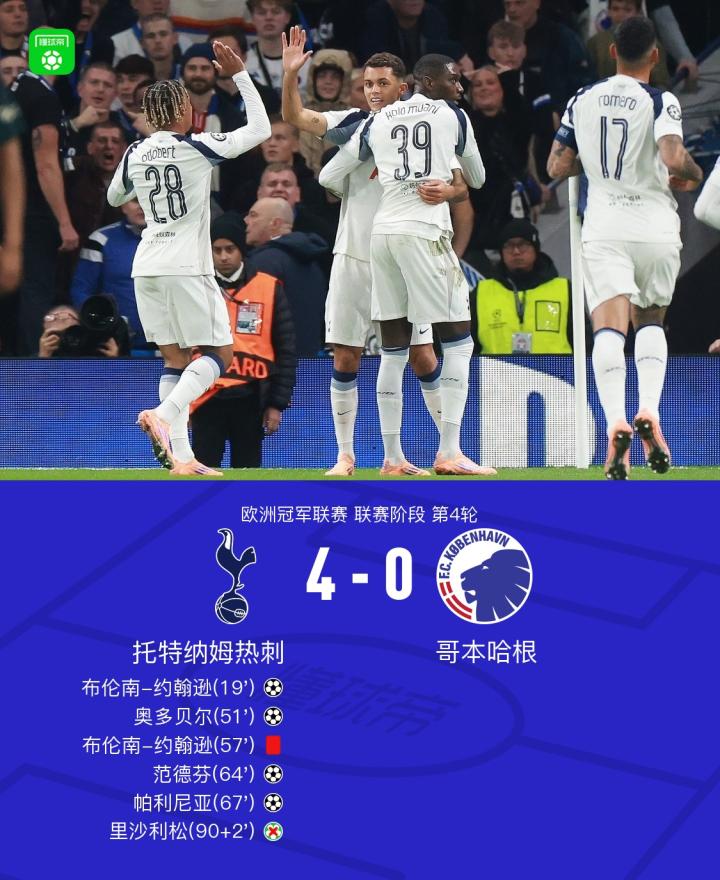 十人热刺4-0哥本哈根,帕利尼亚替补传射,布伦南进球+染红,里沙利松失点