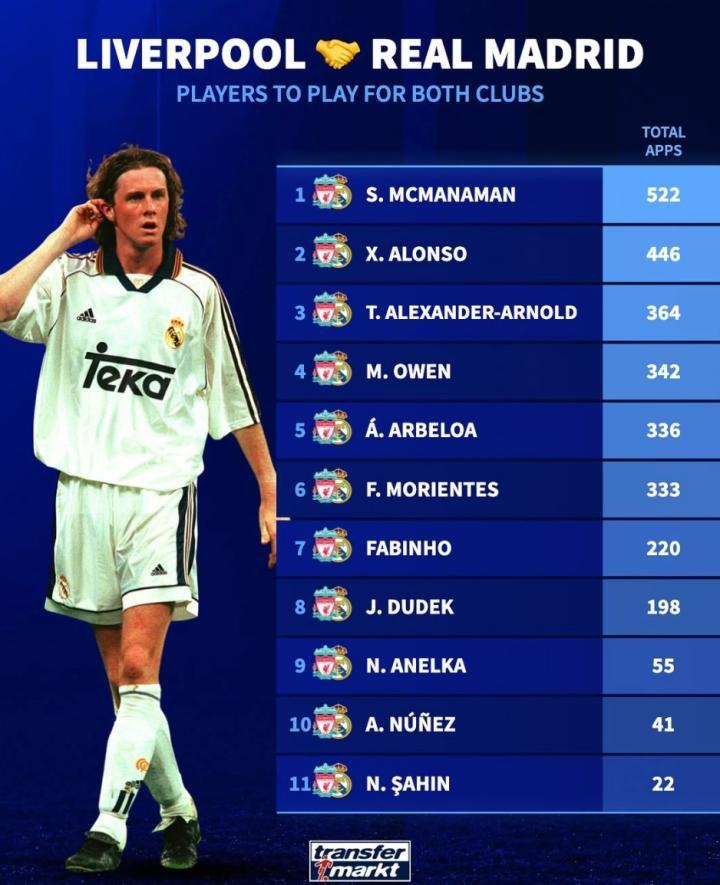 北京时间11月5日,在欧冠联赛阶段第4轮的比赛中,利物浦主场1-0击败了皇家马德里,与此同时德转则统计出了曾代表两家俱乐部出场的11名球员,其中包括了麦克马纳曼、哈维-阿隆索、亚历山大-阿诺德以及迈克尔-欧文。
