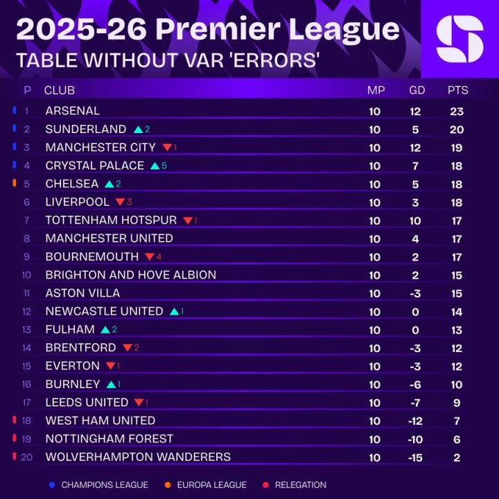 Squawka每周让球迷投票选出最具争议的VAR判罚。去除了这些争议VAR判罚,英超前十轮的英超积分榜中,切尔西将积18分来到第五位,利物浦将同积18分排名第六。
