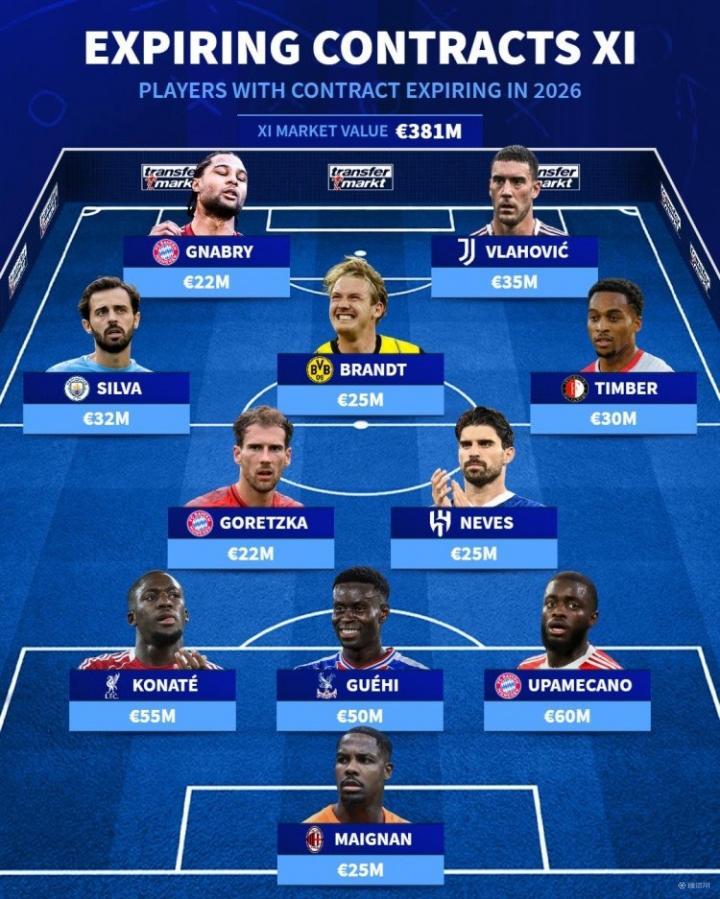 北京时间11月9日,德转市场列出明年合同到期的最贵11人阵容,格纳布里、B席、于帕梅卡诺、格伊在列。