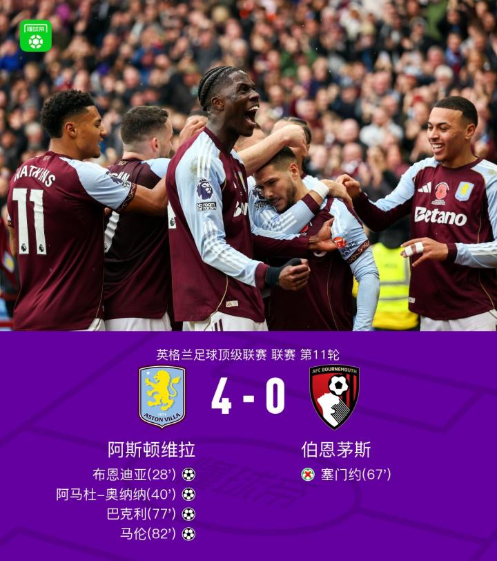 维拉4-0伯恩茅斯,大马丁扑点,恩布迪亚、奥纳纳、马伦破门