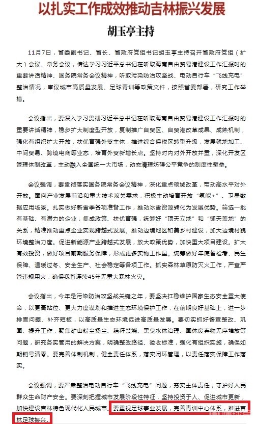 吉林省政府党组(扩大)会议、常务会议中强调的部分内容——要重视足球事业发展,完善青训中心体系,推进吉林足球振兴。