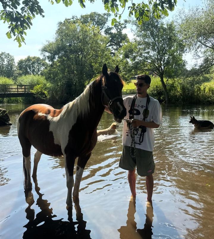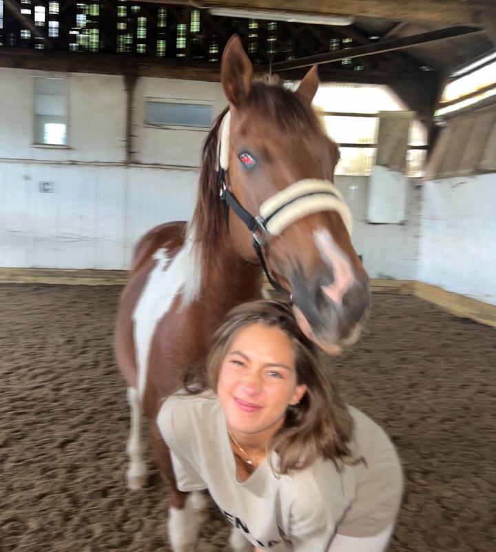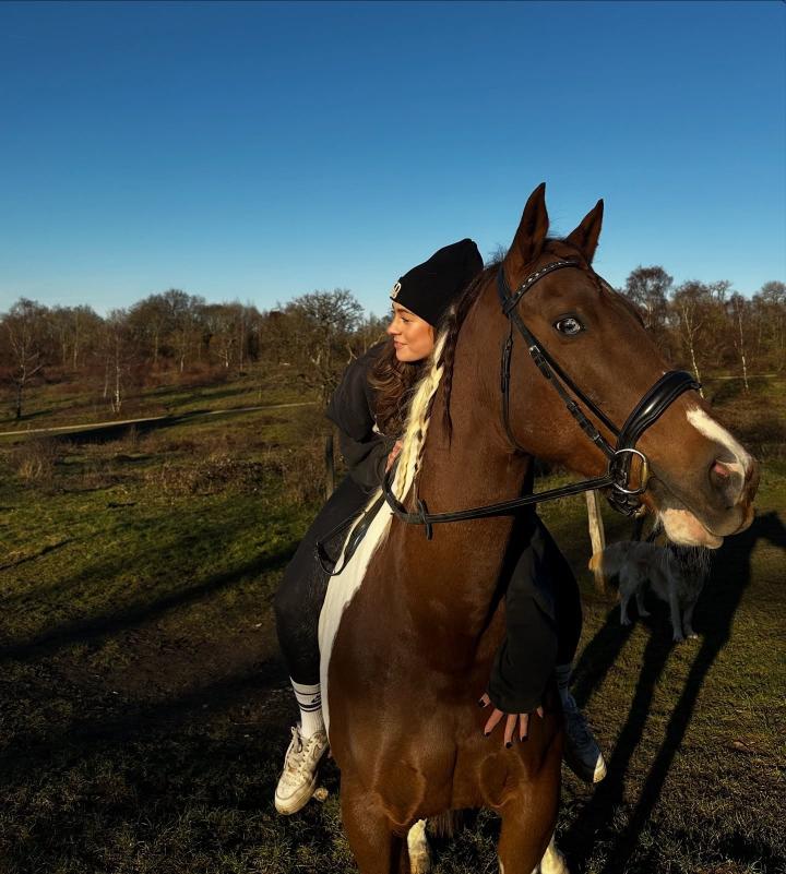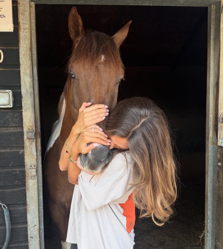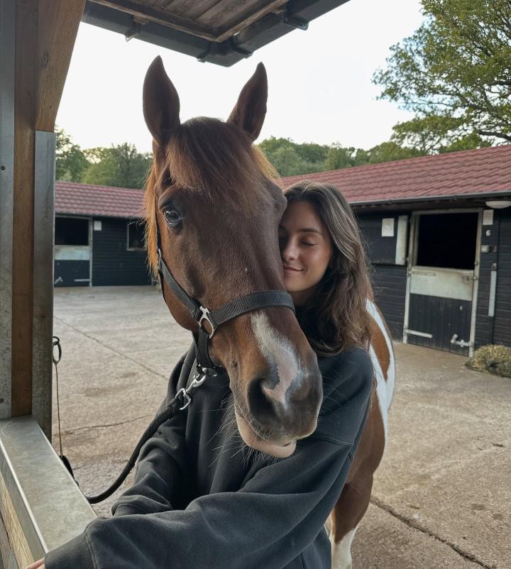 索菲娅在社交媒体上发布了一组与爱马Cielo的照片和视频,画面中有她亲吻、依偎着这匹棕白相间的马,也有哈弗茨站在溪水旁陪伴它的身影。
