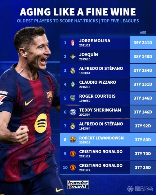 北京时间11月11日,在莱万多夫斯基用帽子戏法帮助巴塞罗那客场4-2战胜塞尔塔之后,德转列出了欧洲五大联赛历史上上演帽子戏法最年长的10位球员,莱万以37岁80天的年纪排名第8,C罗在榜单中占据了两个位置。