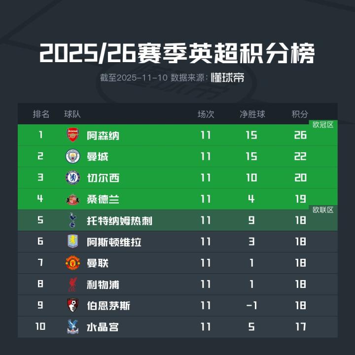 目前英超11轮战罢,阿森纳以8胜2平1负的战绩积26分位列榜首,曼城以7胜1平3负的战绩积22分位列第二,利物浦则以6胜5负的战绩位列第八。