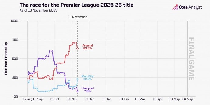 北京时间11月11日,Opta更新英超本赛季争冠概率走势:阿森纳目前63.6%领跑,曼城22.9%暂列第二,利物浦从赛季初被看好跌到目前的7% 。