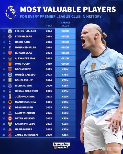 北京时间11月11日,德转统计出了本赛季英超20家俱乐部历史身价最高的球员,2024年身价曾达到2亿欧元的哈兰德独自领跑,阿扎尔、哈里-凯恩、萨拉赫以及萨卡1.5亿欧元并列第2。
