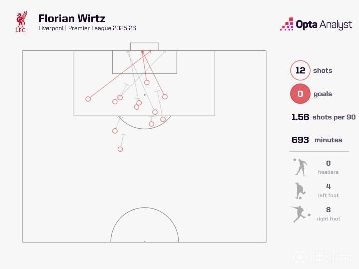 英超11轮过后,利物浦新援维尔茨仍未取得进球,也没有助攻入账,数据相当惨淡。