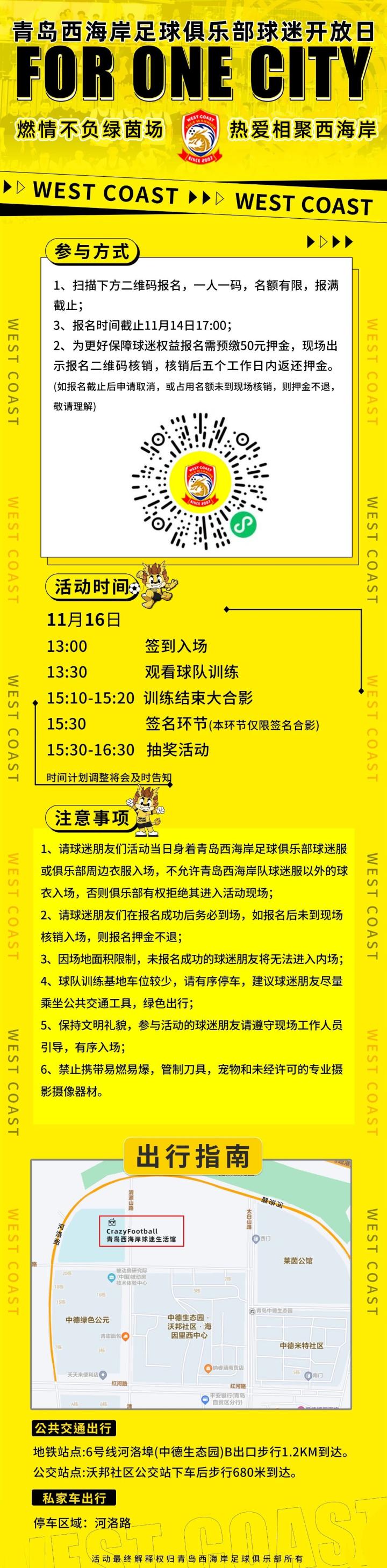 北京时间11月12日,青岛西海岸官方发布公告,俱乐部将在11月16日举办球迷开放日。