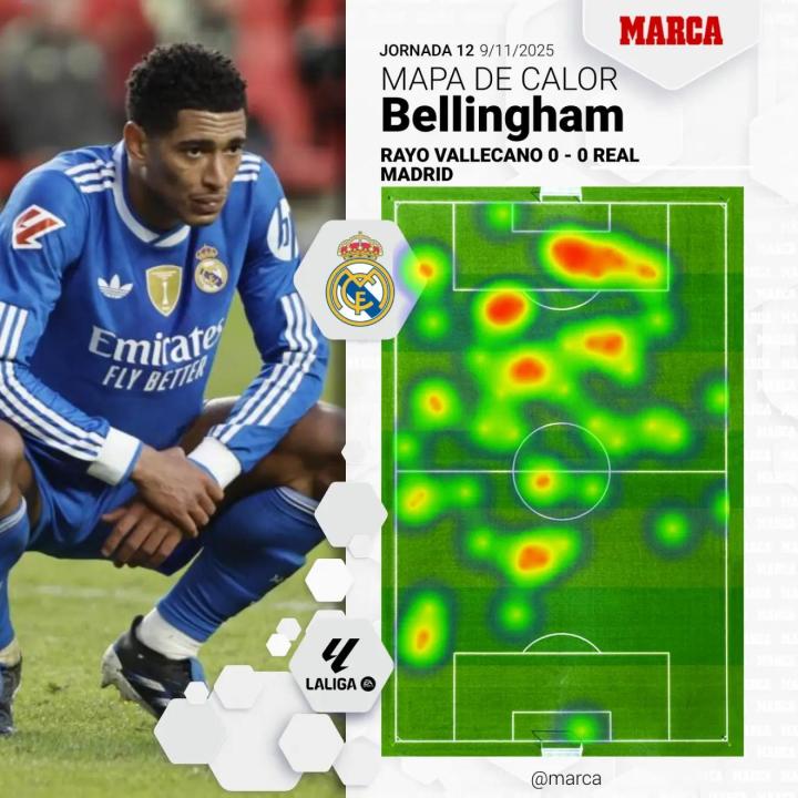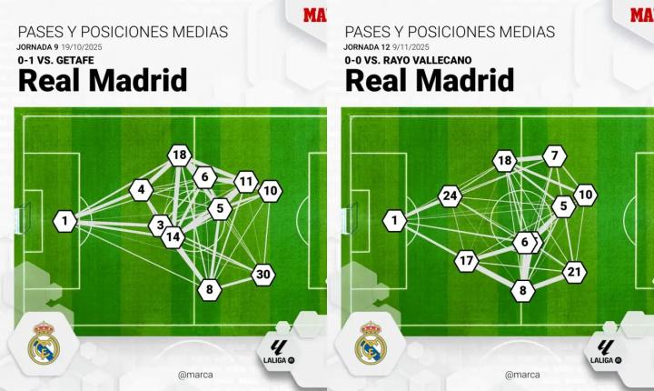 传球地图勾勒出这一更深层次变化的X光片。在赫塔费一役中,球队整体紧凑,后腰与贝林厄姆之间形成了清晰的三角形连接,能够通过中场将球队串联起来。但在巴列卡诺,局面被拉长,卡马文加和居莱尔的位置重叠,贝林厄姆变得更加孤立。传球线路转移到了边路。由于难以通过中场推进,边后卫——巴尔韦德和卡雷拉斯——成为了新的发起者。中场的配合逐渐消散于一张更宽但也更脆弱的网络之中。
