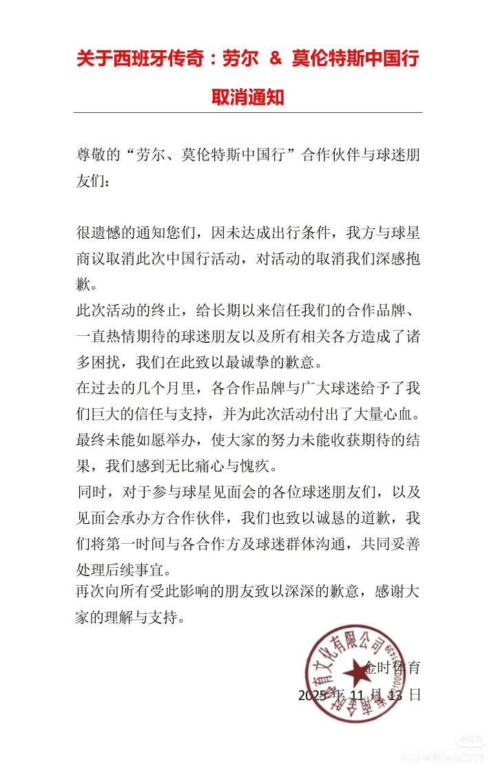 北京时间11月13日晚,劳尔&莫伦特斯中国行主办方金时体育宣布,这场活动因未达成出行条件取消。