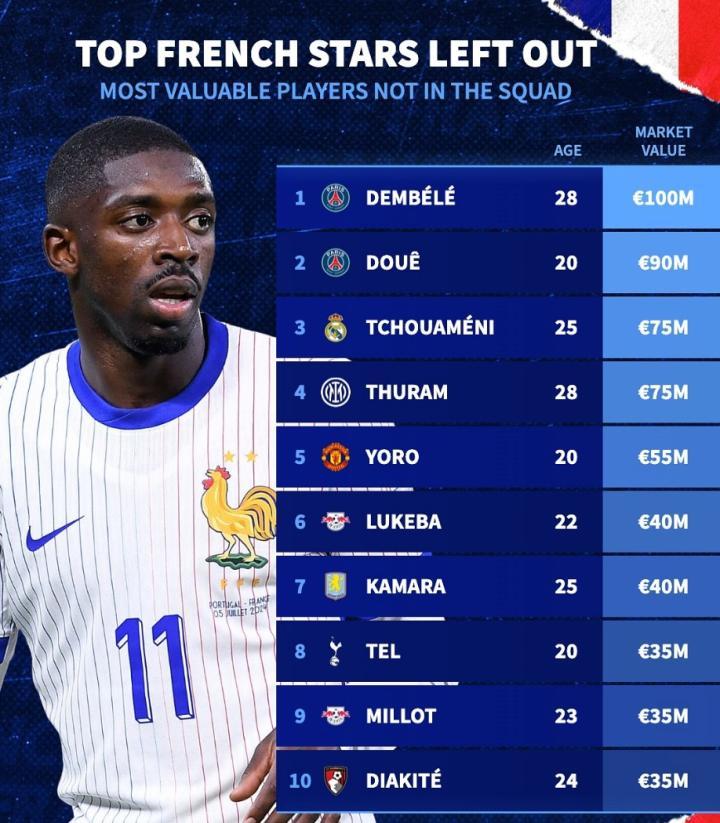 北京时间11月14日,法国队在世预赛欧洲区D组倒数第二轮的比赛中主场4-0战胜了乌克兰,提前一轮晋级2026年世界杯决赛圈。与此同时,德转则统计出了此次未能入选法国队大名单身价最高的10位球员,登贝莱领衔,杜埃、楚阿梅尼、马库斯-图拉姆、约罗以及马蒂斯-特尔在列。