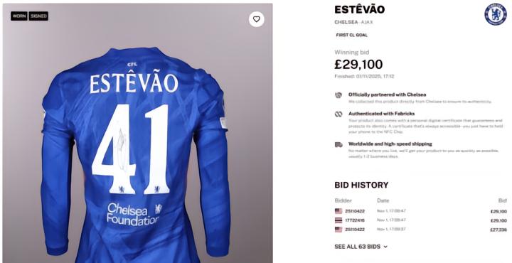 切尔西球员帕尔默与埃斯特旺成为该平台上的热门人物。帕尔默在去年对布莱顿比赛中攻入四球的那件球衣最终以34411英镑成交,而埃斯特旺在对阿贾克斯比赛中打进个人第一粒欧洲冠军联赛进球的球衣则卖出29100英镑。