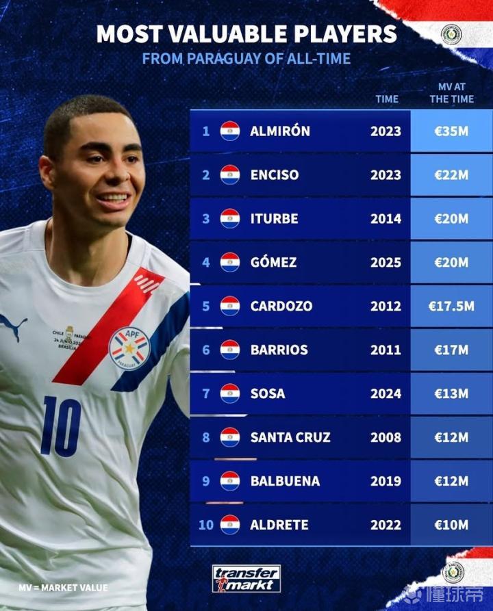北京时间11月16日,德转列出了巴拉圭历史身价排名前10的球员,2023年身价曾经达到3500万欧元的阿尔米隆高居第一,恩西索2200万欧元第二,伊图尔韦2000万欧元第三,名单上还包括了拜仁慕尼黑名宿圣克鲁斯以及多特蒙德和广州恒大旧将卢卡斯-巴里奥斯。