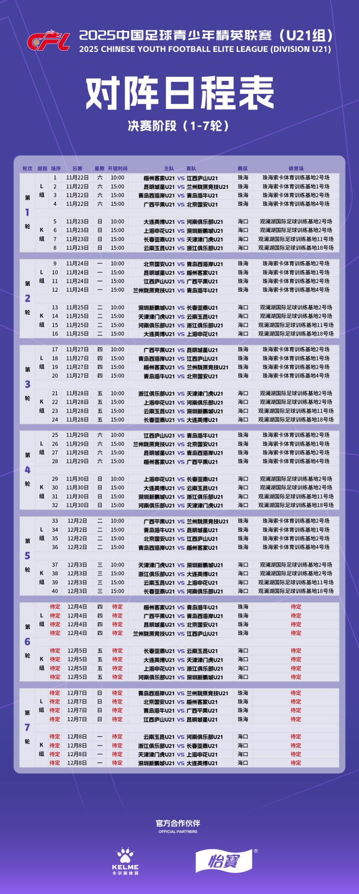 2025中国足球青少年精英联赛(U21组)决赛阶段赛程将于11月22日至12月8日期间在珠海、海口两个赛区进行。决赛阶段将按照晋级赛排名分成K组(晋级赛1-8名)和L组(晋级赛9-16名)两个小组,进行组内单循环比赛,共进行7轮56场比赛,根据积分情况决定最终排名。