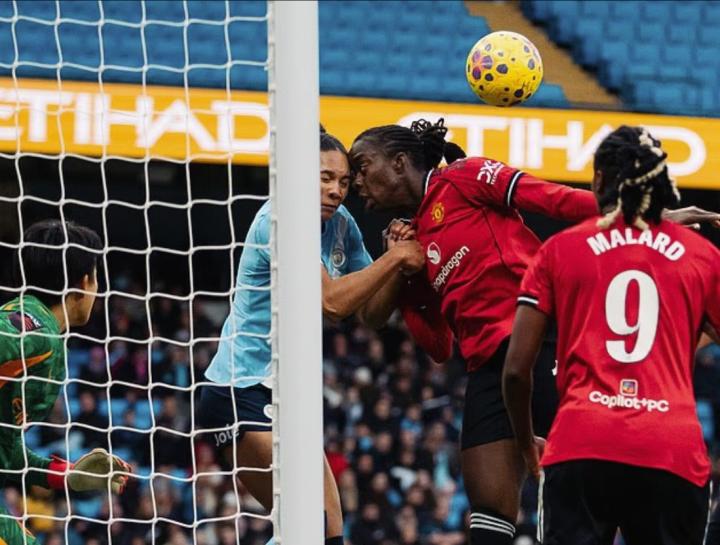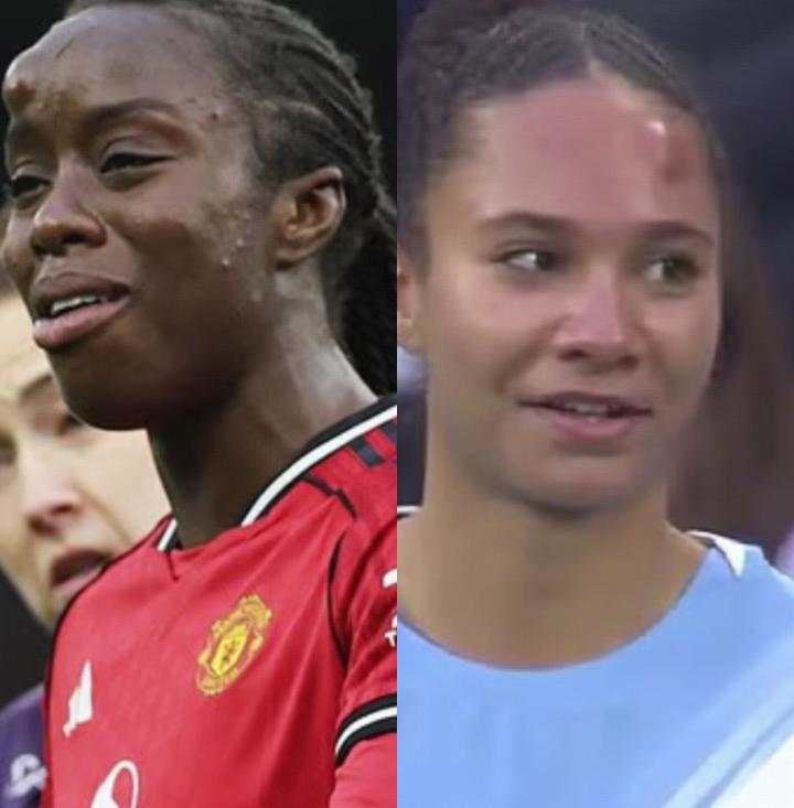 曼联女足球员阿武乔和曼城女足球员杰德-罗斯在下半场临近结束时,因争顶头球时头部相撞,二人双双倒地,导致比赛长时间中断。