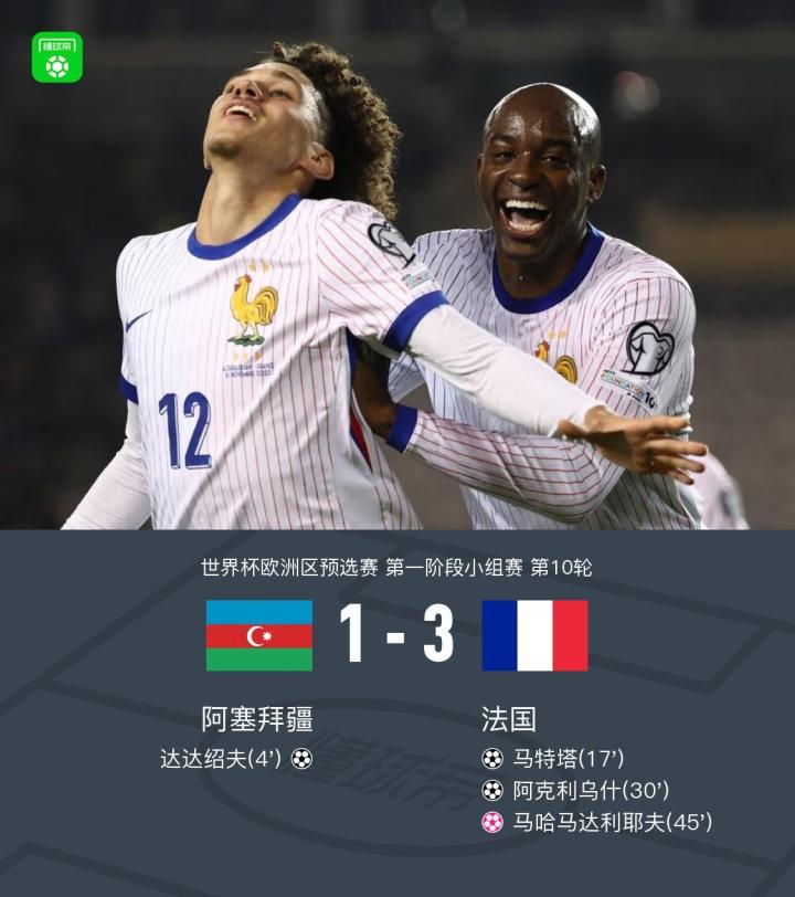 法国客场3-1逆转阿塞拜疆,马特塔、阿克利乌什破门,古斯托两助攻