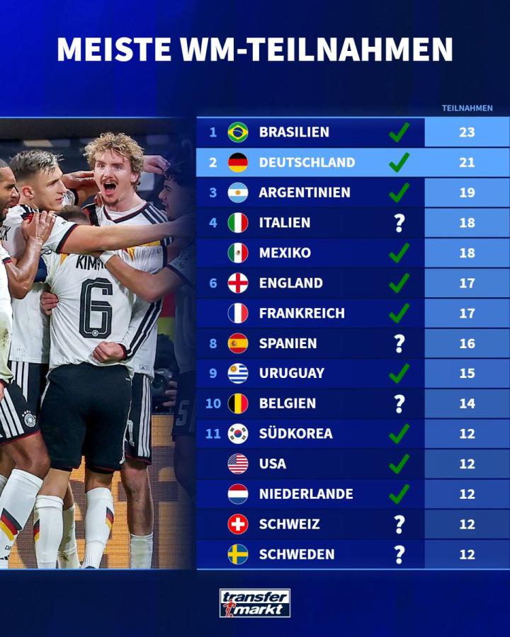 在德国队晋级2026年世界杯后,德国转会市场网站列出了世界杯参赛次数排行榜,德国队以21次位列第二,仅次于从未缺席的巴西队。