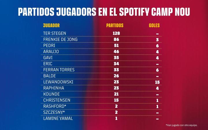 巴萨将在本周末重返诺坎普,坐镇主场迎战毕尔巴鄂竞技,在此之前,巴萨官方统计了队内现役球员在诺坎普的出场次数,特尔施特根以128次居首,弗朗基-德容以86次排名第二。