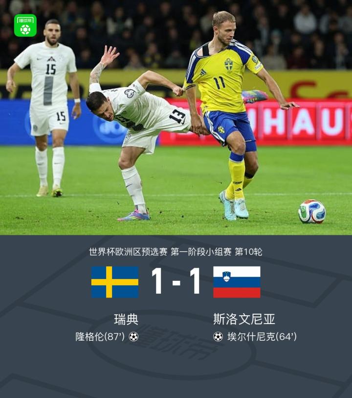 瑞典1-1斯洛文尼亚,埃尔什尼克破门,隆格伦绝平