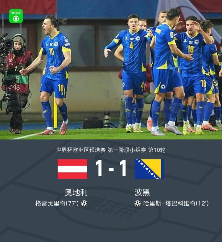 奥地利1-1波黑晋级世界杯,塔巴科维奇破门,格雷戈里奇救主