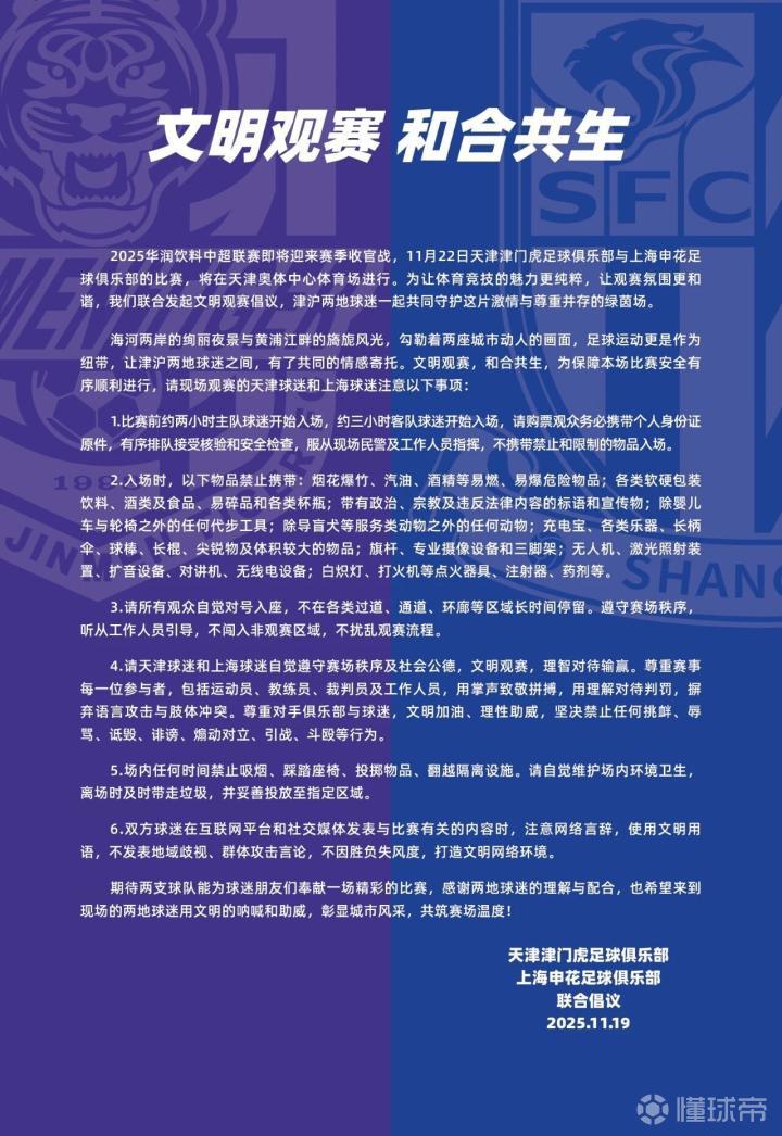 11月19日,上海申花足球俱乐部、天津津门虎足球俱乐部发布联合倡议,呼吁球迷在中超最后一轮文明观赛。