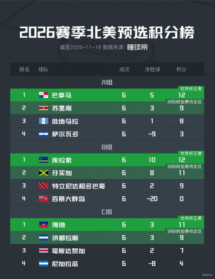 北京时间11月19日,美加墨世界杯北美预选第三阶段已全部结束,巴拿马,库拉索和海地直接出线,比赛第93分钟,危地马拉打入一粒乌龙球,洪都拉斯因为进球劣势出局。海地时隔52年重返世界杯,库拉索队史首进世界杯,巴拿马自2018年后再进世界杯。