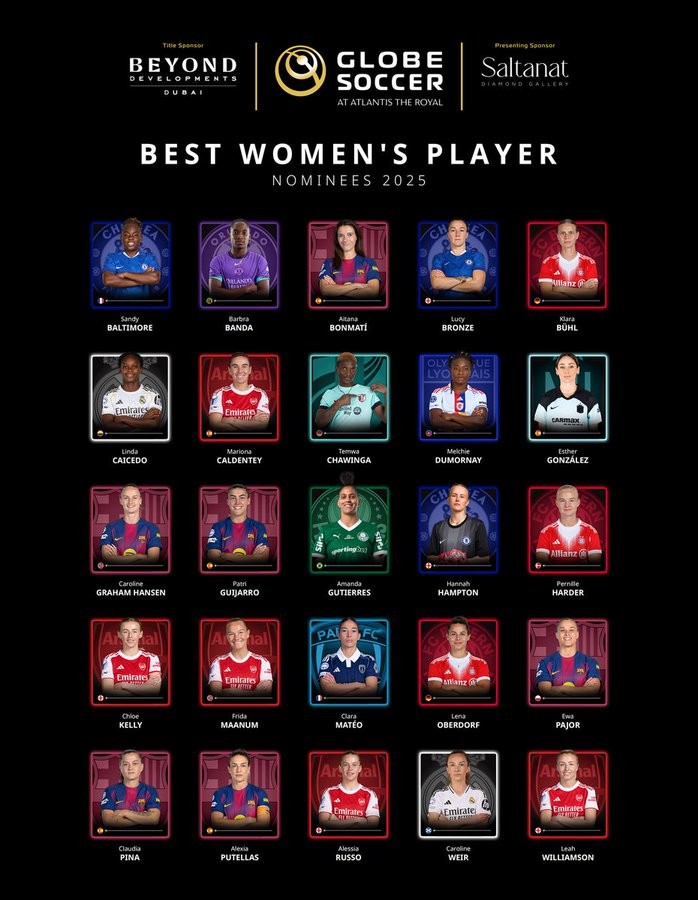 北京时间11月19日,环球足球奖公布了2025年最佳女足球员候选名单,邦马蒂、普特利亚斯、凯莉在列。