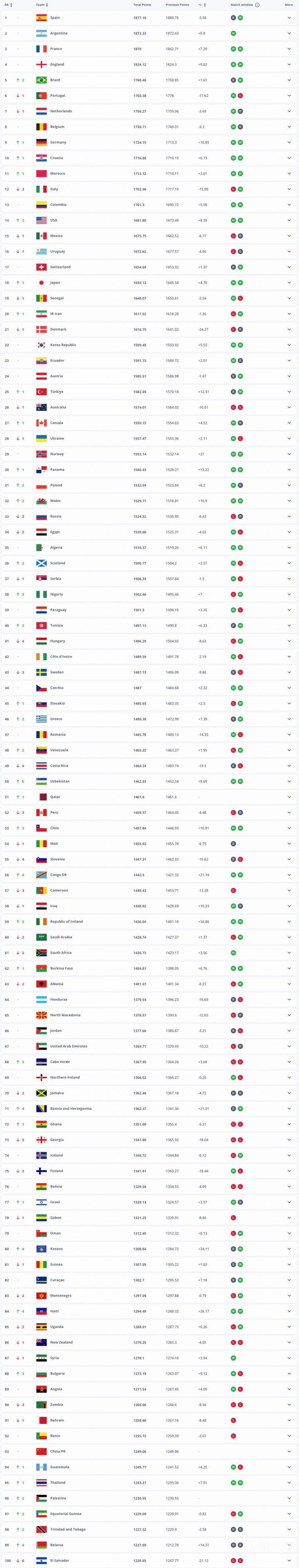 北京时间11月19日,FIFA公布最新世界排名,西班牙队排名第一,阿根廷排名第二,法国排名第三。中国仍居第93位。西阿法英巴葡荷比德锁定世界杯种子队。