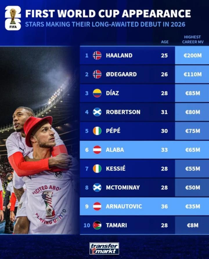 北京时间11月20日,德转统计出了明年将会首次参加世界杯历史身价排名前10的球员,哈兰德、厄德高以及路易斯-迪亚斯位列前三,罗伯逊、阿拉巴、麦克托米奈上榜。