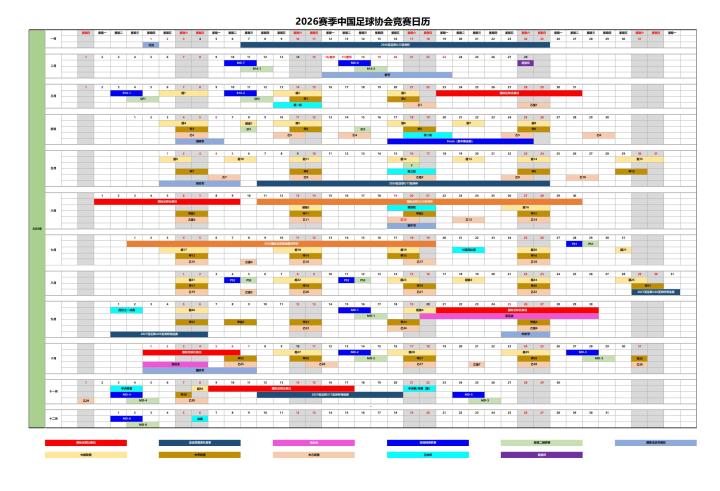 为统筹国家队集训比赛、职业联赛、足协杯赛等相关竞赛事宜,中国足协制定2026赛季竞赛日历(国际足联比赛日、亚足联国家队赛事、亚运会、亚冠精英联赛、亚冠二级联赛、中超、中甲、中乙、足协杯、超级杯),具体如下:
