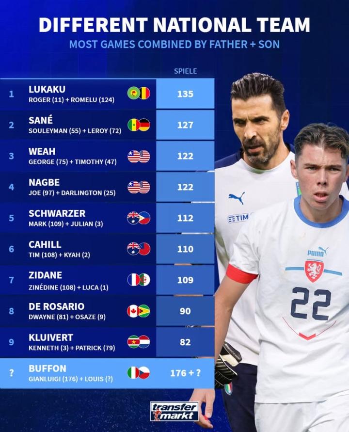 北京时间11月20日,在路易斯-布冯本月国际比赛日代表捷克U19出战3场比赛两次上演帽子戏法的情况下,德转列出了代表不同国家队合计出场次数排名前9的父子组合,卢卡库、萨内以及维阿父子位列前3。